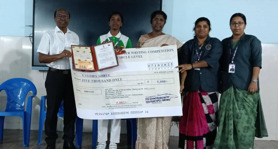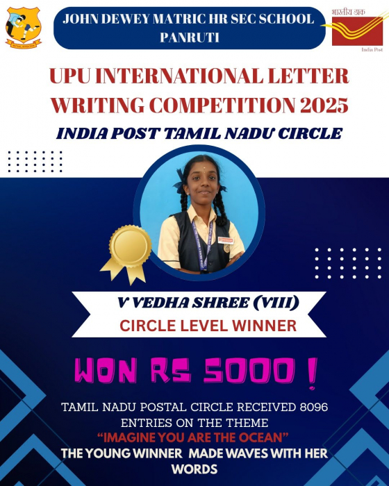 V. Vedha Shree secured Third Place at the Tamil Nadu Circle Level, and received a cash award of ₹5,000 from the Postal Department